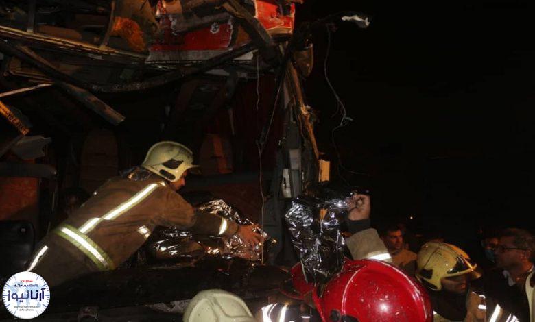 وی افزود: راننده و شاگرد راننده همان اتوبوس به دلیل شدت تصادف پشت داشبورد و فرمان محبوس شده بودند که آتش نشانان قطعات را برش دادند و این افراد را خارج کردند. در نهایت ۱۷ نفر از اتوبوس مذکور دچار مصدومیت شدند که همه مصدومان این حادثه مسافران این اتوبوس بودند.